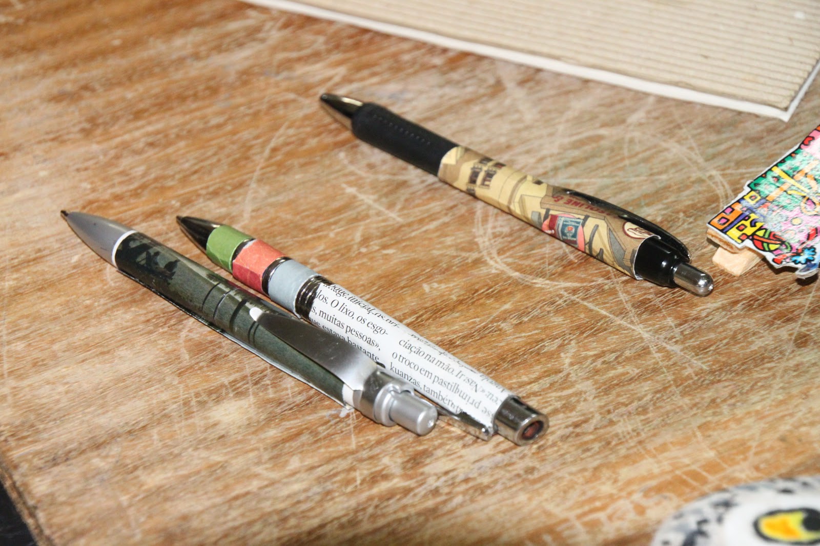 Inicialmente dispôs-se tudo por mesas. Haviam seis mesas. Uma para o chá (que não podia faltar), outra para pintar aqueles copinhos de vidro dos iogurtes para por velas e pintar também pedras a fazer de pisas papeis, mais adiante uma com molinhas de madeira e recortes para fazer clips e missangas e fios para bijutaria, outra para molduras recicladas e espanta espíritos, outra para decorar cadernos e canetas e por fim, outra para os embrulhos. Creio que as únicas coisas a serem feitas foram os copos para as velas, pulseiras, canetas (imensas!), algumas molduras e pouquíssimos embrulhos. Houveram pessoas menos interessadas, outras mais, mas no fim, saíram coisas bem originais. Como se pode ver nas fotografias. Esta iniciativa deveria repetir-se e alargar-se a outras escolas.